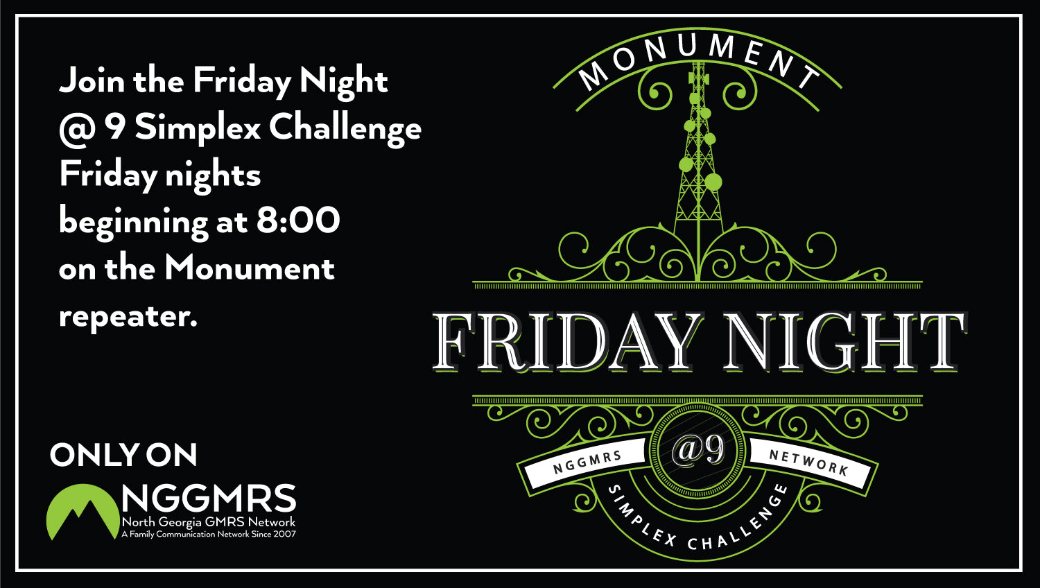 Every Friday night beginning at 8:00 on the Monument Repeater.