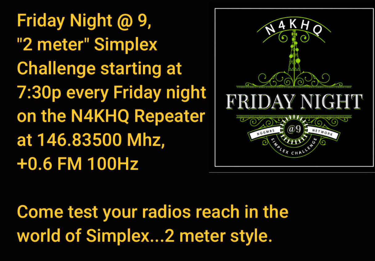 Every Friday night beginning at 7:30 on the N4KHQ repeater.