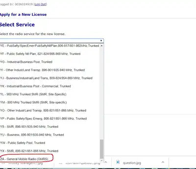 From the drop down SELECT SERVICE menu pick GMRS which is the LAST ONE on the list with code ZA. (No idea why it's ZA)